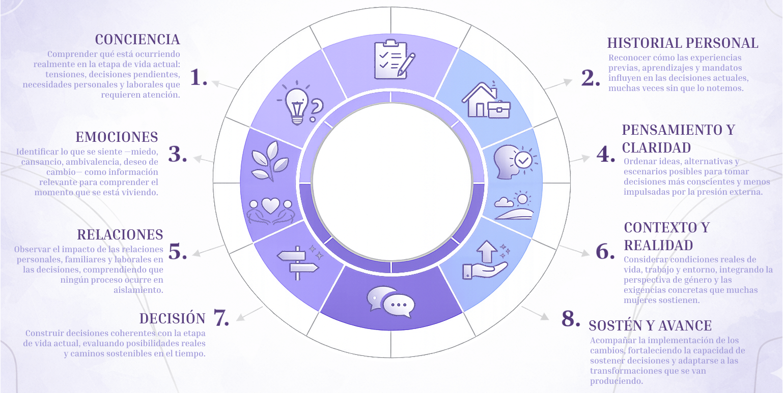Por ello, el proceso no se centra solo en metas o resultados, sino en comprender con mayor profundidad la etapa que se está viviendo, clarificar decisiones y construir cambios sostenibles en el tiempo.
